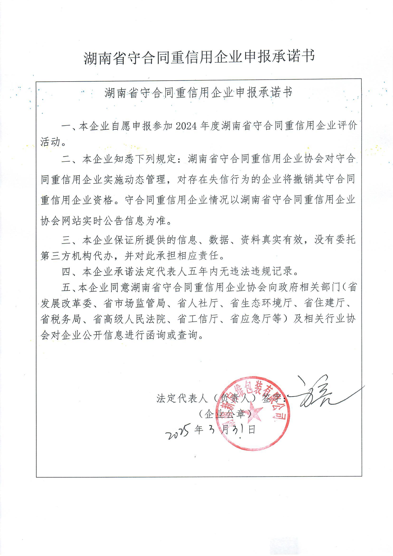 本企業(yè)根據(jù)《湘潭市守合同重信用企業(yè)申報規(guī)定》等編制 2024 年度企業(yè)信用報告書,并保證本報告書內(nèi)容真實(shí)、準(zhǔn)確、完整。