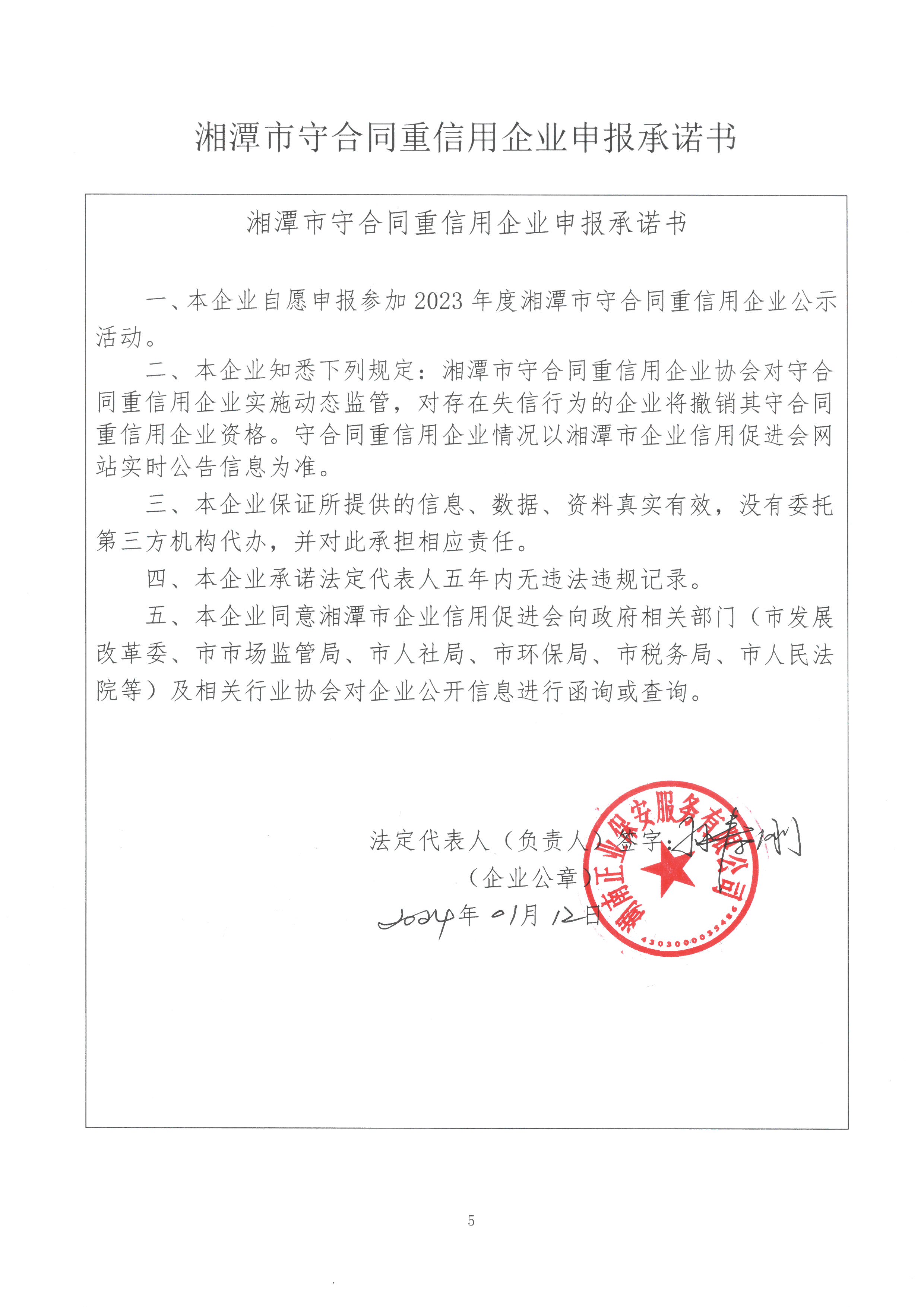 本企業(yè)根據(jù)《湘潭市守合同重信用企業(yè)申報(bào)規(guī)定》等編制 2023 年度企業(yè)信用報(bào)告書(shū),并保證本報(bào)告書(shū)內(nèi)容真實(shí)、準(zhǔn)確、完整。