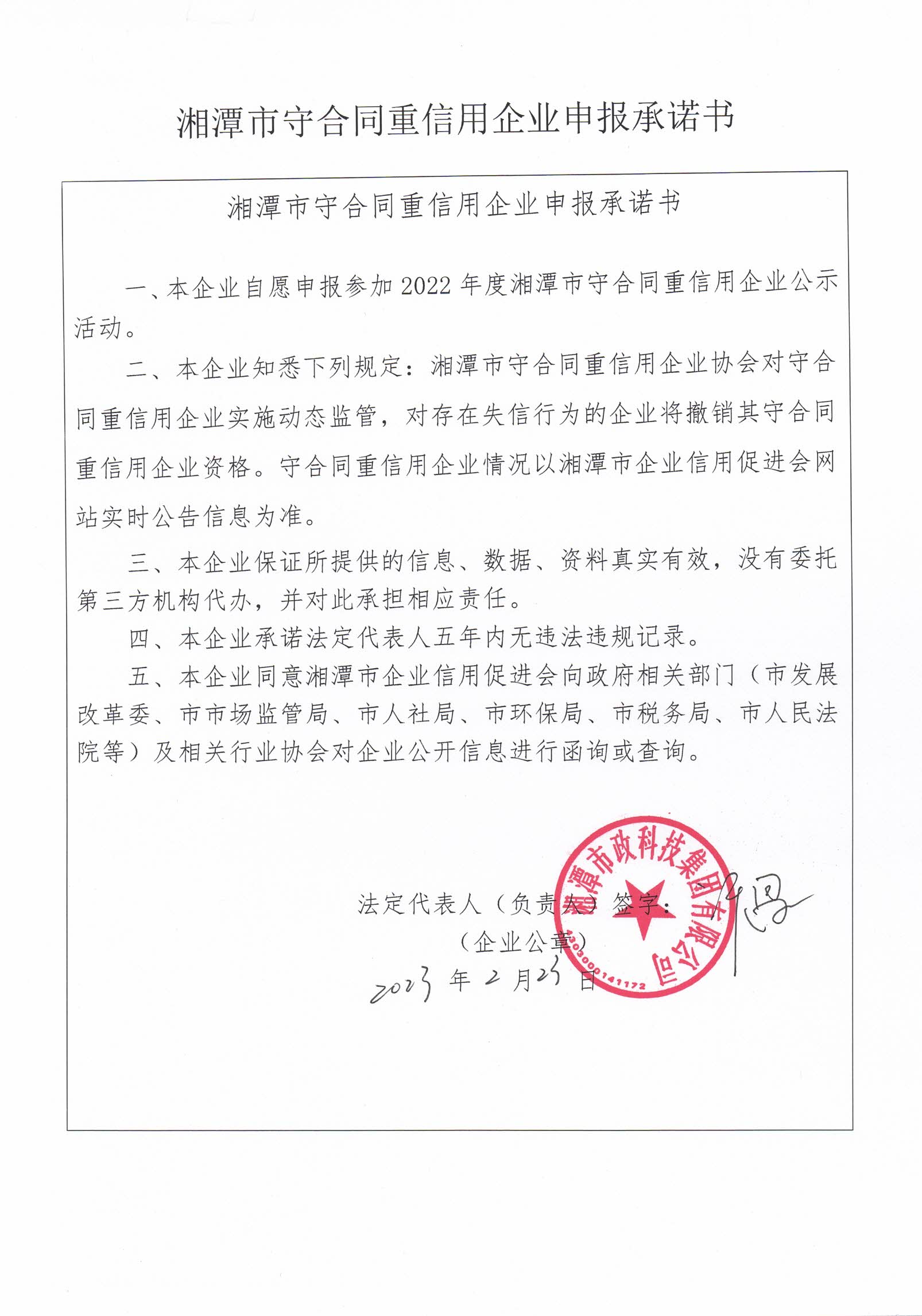本企業(yè)根據(jù)《湘潭市守合同重信用企業(yè)申報(bào)規(guī)定》等編制 2022 年度企業(yè)信用報(bào)告書,并保證本報(bào)告書內(nèi)容真實(shí)、準(zhǔn)確、完整。